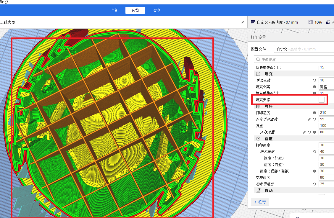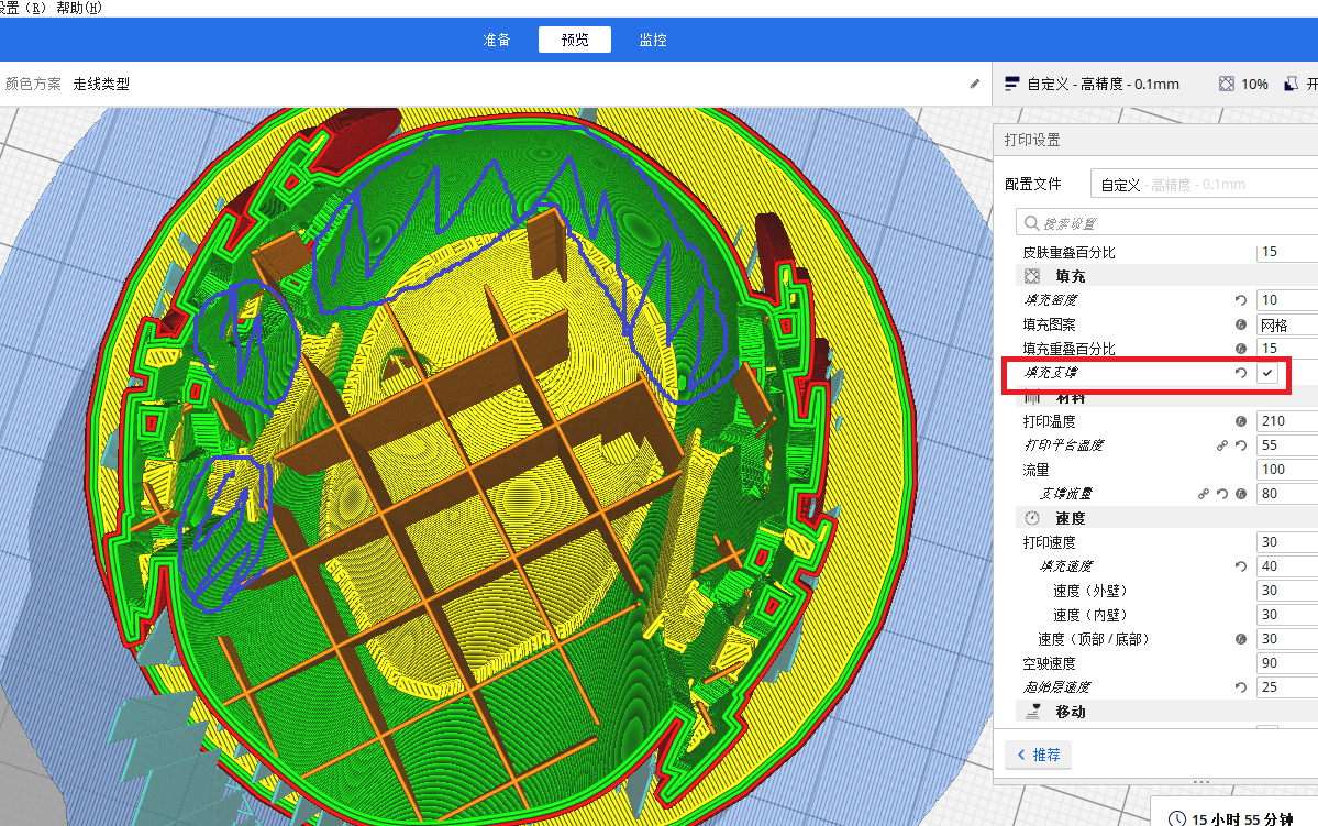 此功能可實(shí)現(xiàn)只在模型頂部需要支撐的區(qū)域產(chǎn)生填充,相比無填充,保證了模型頂部不會掉落,并較大幅度減少了打印時間和用料。