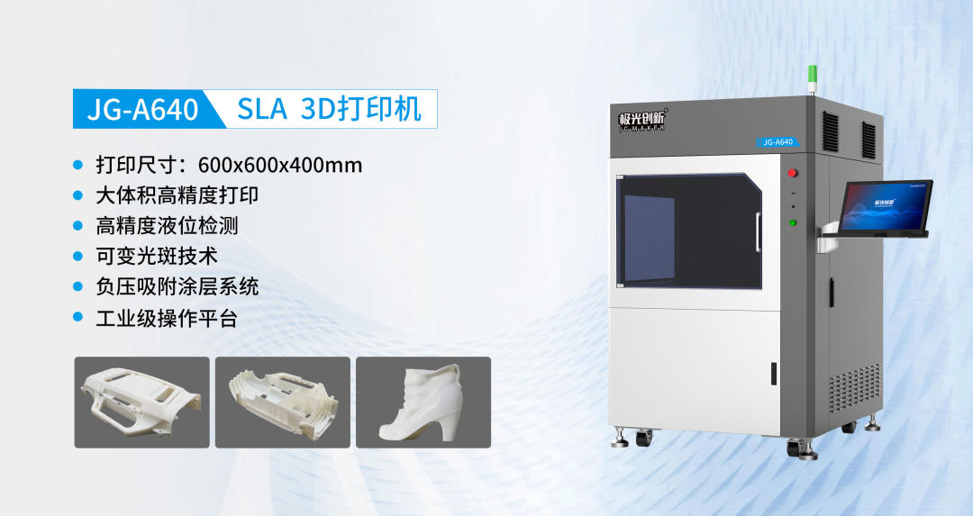 在展位上宣傳展示的一系列產(chǎn)品中,極光創(chuàng)新王牌級產(chǎn)品JG-A640工業(yè)級光固化3D打印機(jī)當(dāng)仁不讓占領(lǐng)C位,JG-A640依據(jù)其大體積、高精度、低成本的特點,更大限度的提高了生產(chǎn)率和靈活度,高達(dá)0.05m的精度等級,可制作各種結(jié)構(gòu)復(fù)雜的精密零件和組裝件。