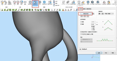 ③在功能頁(yè)上,可選擇設(shè)置倒角,即將尖銳的切割角去銳化,也設(shè)置間隙,以方便后期拼合。另外有一個(gè)比較重要的功能,即“鎖定多段線”,由于模型和切割線并不是保持不變相對(duì)位置,而是可調(diào)整的,所以這個(gè)的功能的開(kāi)啟和關(guān)閉能改變不同的切割線固定方式,以方便調(diào)整模型角度切割。