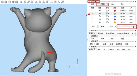 ②在左側(cè)視圖工具頁(yè),選擇“多截面”,類型中即指不同方向軸的截面,當(dāng)然我們也可以點(diǎn)擊展開(kāi)后自行選擇別的截面,如3點(diǎn)確定一個(gè)別的角度的截面。勾選激活某個(gè)截面后,拉動(dòng)下方的移動(dòng)軸即可控制模型上的截面的移動(dòng)。同時(shí)我們也可以在“剖視”欄選擇不同的視圖效果,把截面移動(dòng)至自己需要切割的位置。
