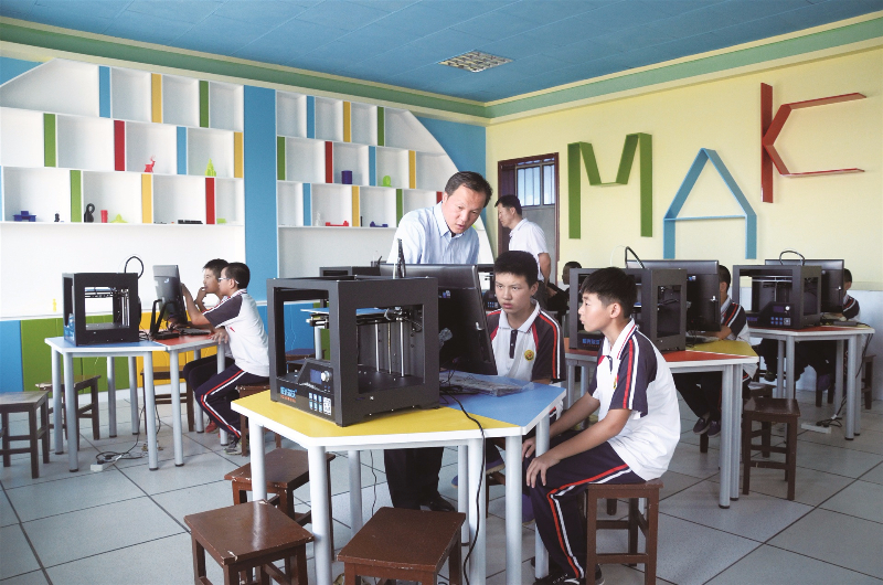 目前,“3D飛天創(chuàng)客空間”正式建成并投入使用。學生通過專業(yè)的中小學建模軟件,自己動手設計3D模型,運用3D打印機打印出茶杯、筆筒等實物,讓學生的想象變?yōu)楝F(xiàn)實。此外,在歷史、生物、地理、化學、物理等課程的教學中,輔助教具都可以通過3D打印制作出來,將抽象、難懂的教學變得直觀形象化,更好地激發(fā)學生的學習興趣。